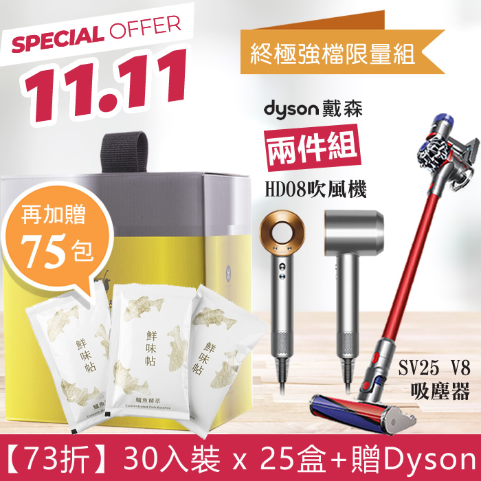 【25盒73折】鱸魚精萃30入/盒×25盒+贈75包+加贈Dyson戴森二件組 V8 SV25 新一代無線吸塵器 + HD08吹風機(銀銅色)